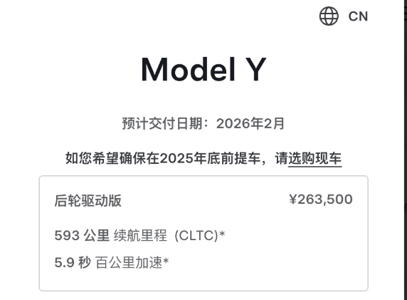 特斯拉中国官网同时提示:“如您希望确保在2025年底前提车,请选购现车。”