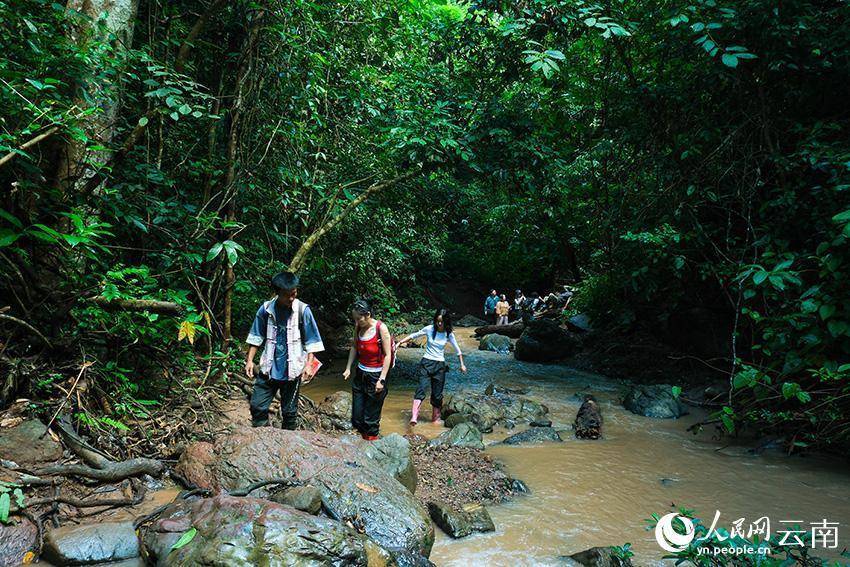 徒步队伍穿行于西双版纳基诺山雨林的溪流之中。人民网 曾智慧摄