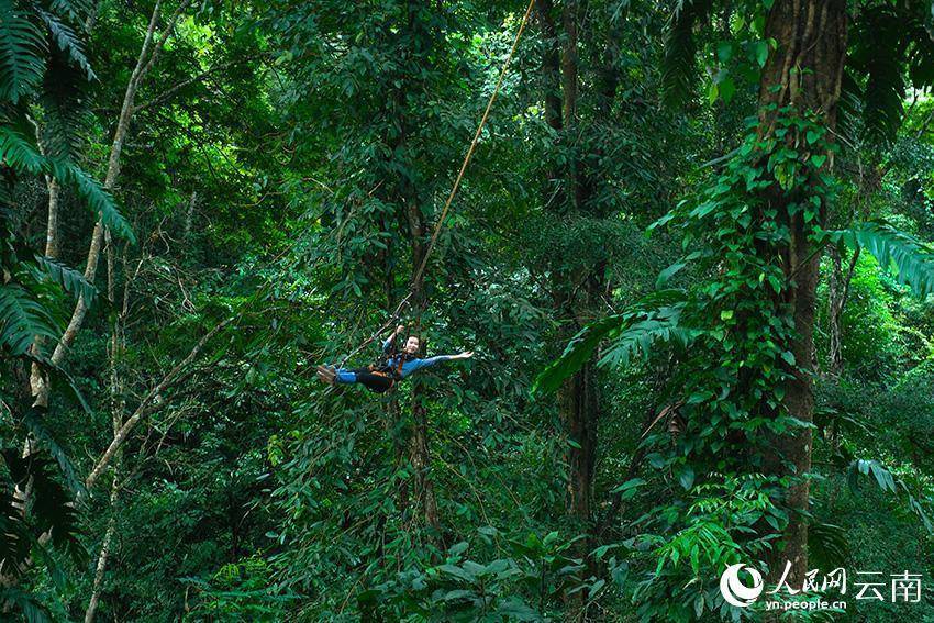 游客在西双版纳基诺山热带雨林体验高空秋千项目。人民网 曾智慧摄