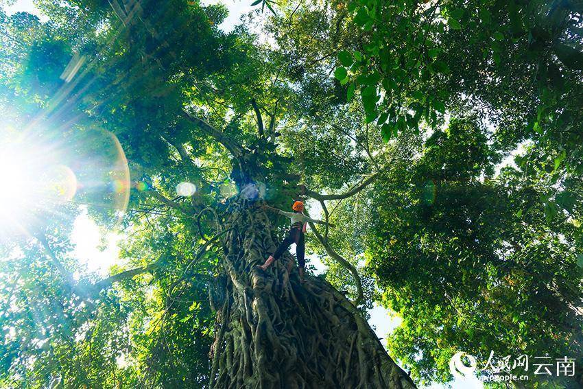 小朋友在工作人员的指导下体验古树攀爬。人民网 曾智慧摄