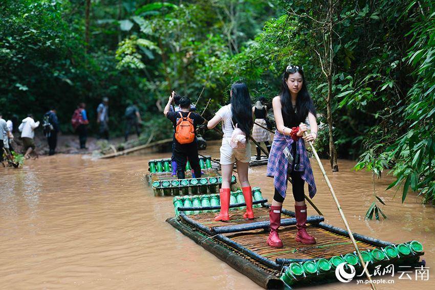 游客在西双版纳基诺山热带雨林中乘竹筏溯溪,感受别样意境。人民网 曾智慧摄