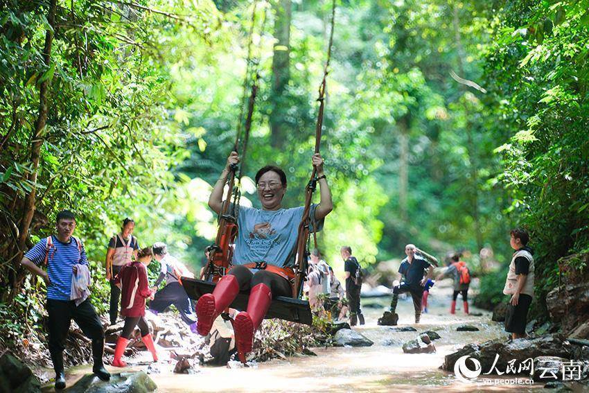 在基诺山热带雨林中,游客体验古树秋千。人民网 曾智慧摄